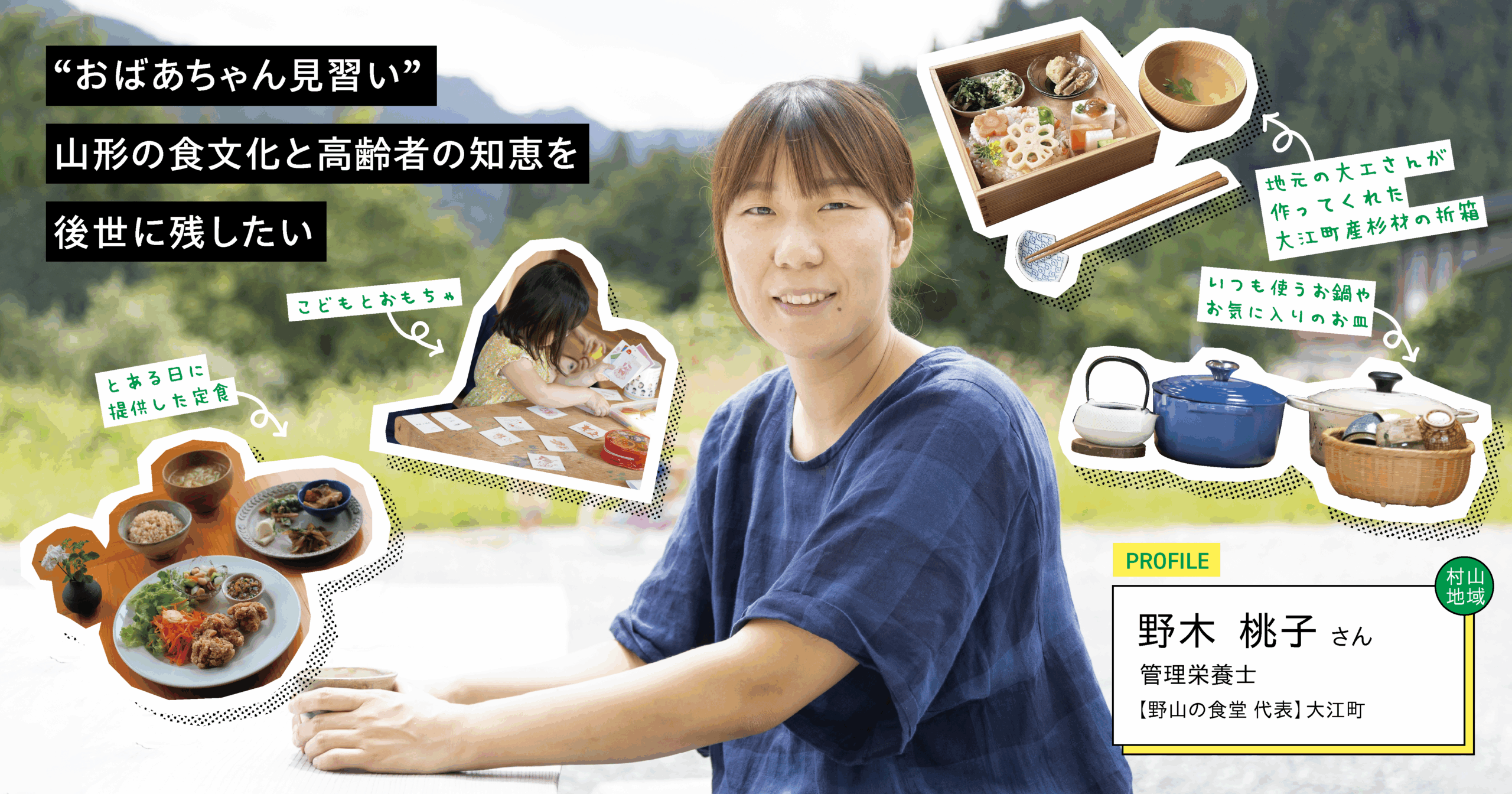 現在は、自ら立ち上げた事業で、地元の豊かな食材を活かした料理を受け継いでいます。農家さんやお年寄りから受け継いだ知恵や食べ方を大切にしながら、施設やイベントの場で「ふるさとの味」を届ける日々。そこには、味覚だけでなく、記憶や思い出、心の温もりまでもが込められています。いつかは「おばあちゃんの林間学校」のように、山形の暮らしを楽しむ知恵がいっぱい詰まった居場所をつくりたい─野木さんの目には、食と暮らしがつながる未来が映っています。