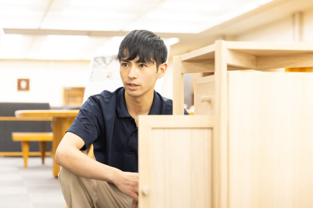 「何もないところから形が生まれる」その瞬間が一番面白いと思います。普段使う机や椅子も、最初はただの木の板。それが少しずつ形になっていく過程は本当に魅力的です。ものづくりに決まった道筋はありません。完成を思い描きながら方法を選び、自由に工夫できるところに大きなやりがいがあります。精度が目に見えてわかるのも、この仕事ならでは。最初は思うようにいかなくても、技能を磨くほど選択肢が増え、できることが広がっていく─そこにものづくりの奥深さを感じています。