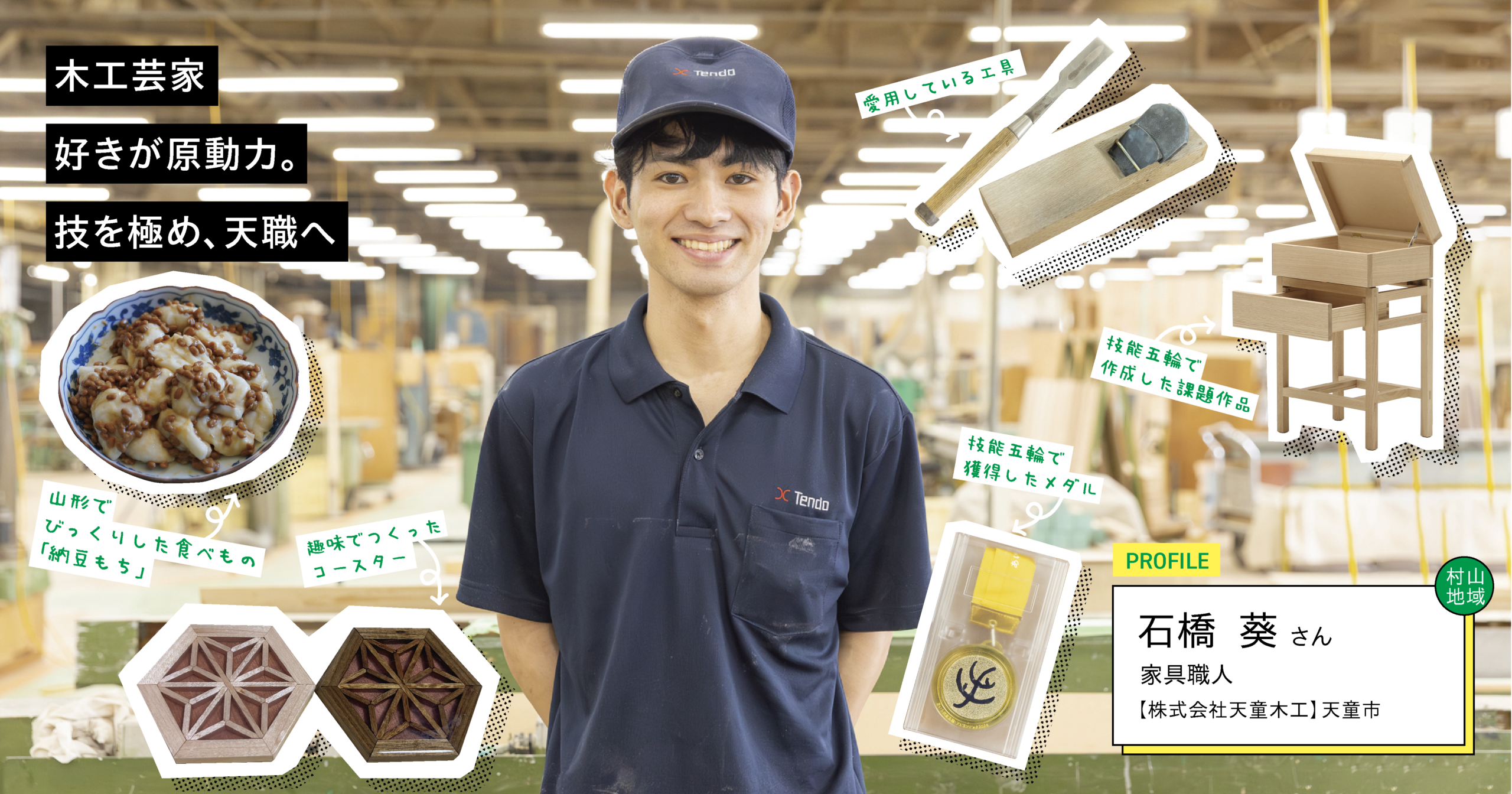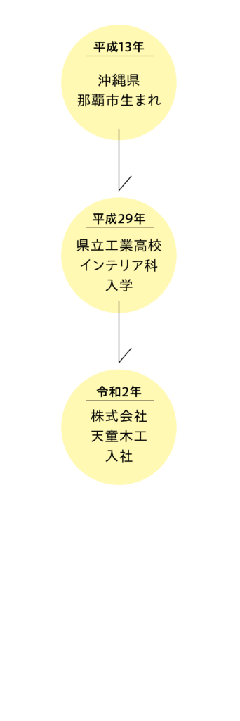 家具職人を志したのは中学2年生のとき。自宅の食器棚が壊れ、自ら修理した経験が原点でした。作業の楽しさに加え、家族の喜ぶ姿が大きな原動力に。その後、工業高校の木工工芸部に入部し、顧問の勧めで技能五輪に出場。天童木工の製造部長から評価を受けたことがきっかけで、同社の作品に強く惹かれ、就職を決意。学生時代の経験が、今の自分を形づくったといいます。