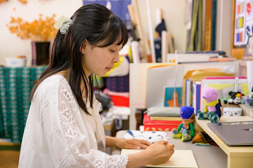 都内の美術大学テキスタイルデザイン学科で織物や染色の技術を学んだ斎藤さん。大学のプロジェクトがきっかけとなり、米沢の老舗企業への就職を機に、山形へ。米沢は自然の美しさと人の温かさにあふれる街だと感じることが多いといいます。地域のイベントや交流会にも積極的に参加する中、人々との出会いや触れ合いから新たなアイデアを得ています。雪景色や夕焼け、山々などの美しい風景や旬の野菜・果物に日常的に触れることも楽しみで、こうした発見や出会いが日々の表現の源になっているそうです。