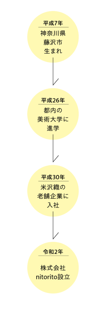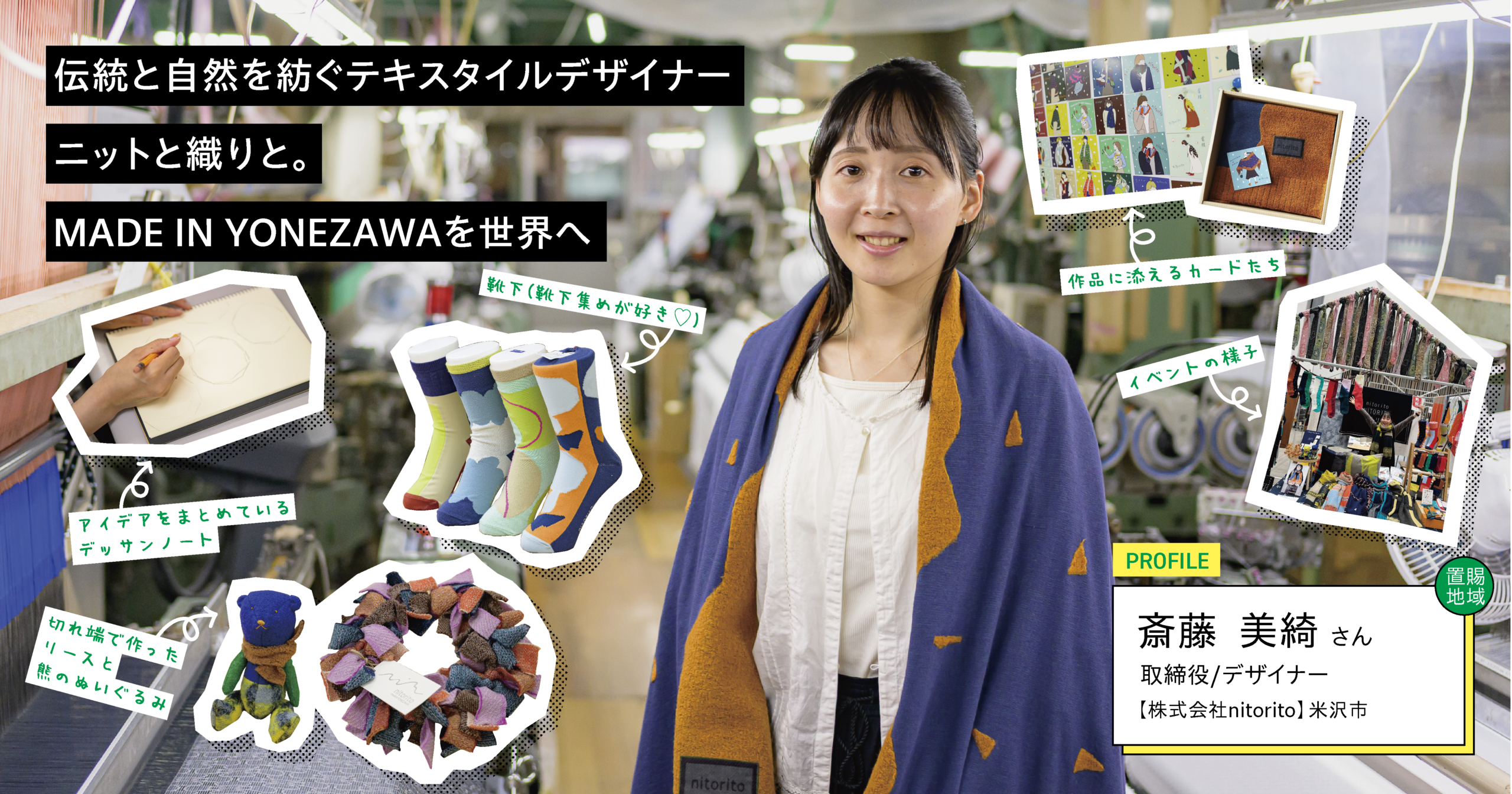 米沢織の老舗で、お客さまの要望に沿ったOEM生地制作に携わる中、米沢の魅力をもっと伝えたいという思いが芽生えるように。「ここにいるから生まれるアイデアや、ここでしかできないデザインを詰め込みたい」ー。そう思うようになった斎藤さんは、仲間とともにテキスタイルブランド「nitorito」を立ち上げます。地域の技術を活かしたものづくりに取り組み、商品開発からデザイン、営業、広報、販売まで精力的に活動。自分の「できること」と「やりたいこと」の両方を実現できる環境で、世界へ向けて発信を続けます。