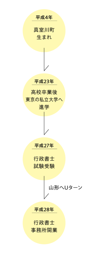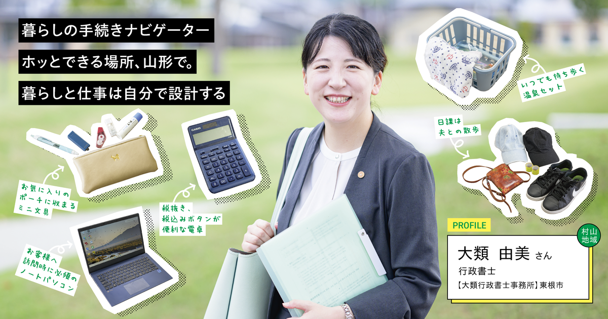 ドラマで見た検察事務官に憧れて法学部へ進学した大類さん。地元で働きたいと思いながらも、山形で自分にぴったりの仕事があるのか分からず、迷った時期もあったといいます。そんなとき、父親から行政書士という仕事を教えてもらったそう。「行政書士は、お客さまが自分で準備するのが難しい書類を代わりに作る仕事です」と大類さん。書類が無事に仕上がり、報告したときにお客さまが笑顔になる瞬間や、その方の役に立てた実感こそが、何よりのやりがいだそうです。