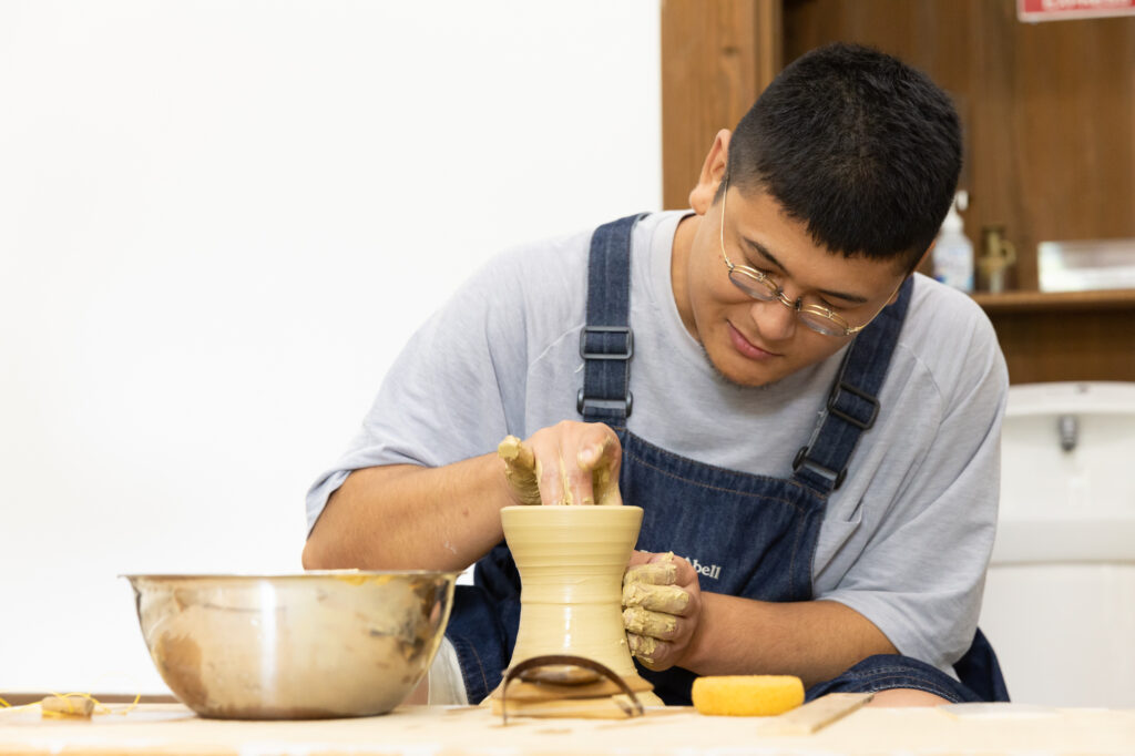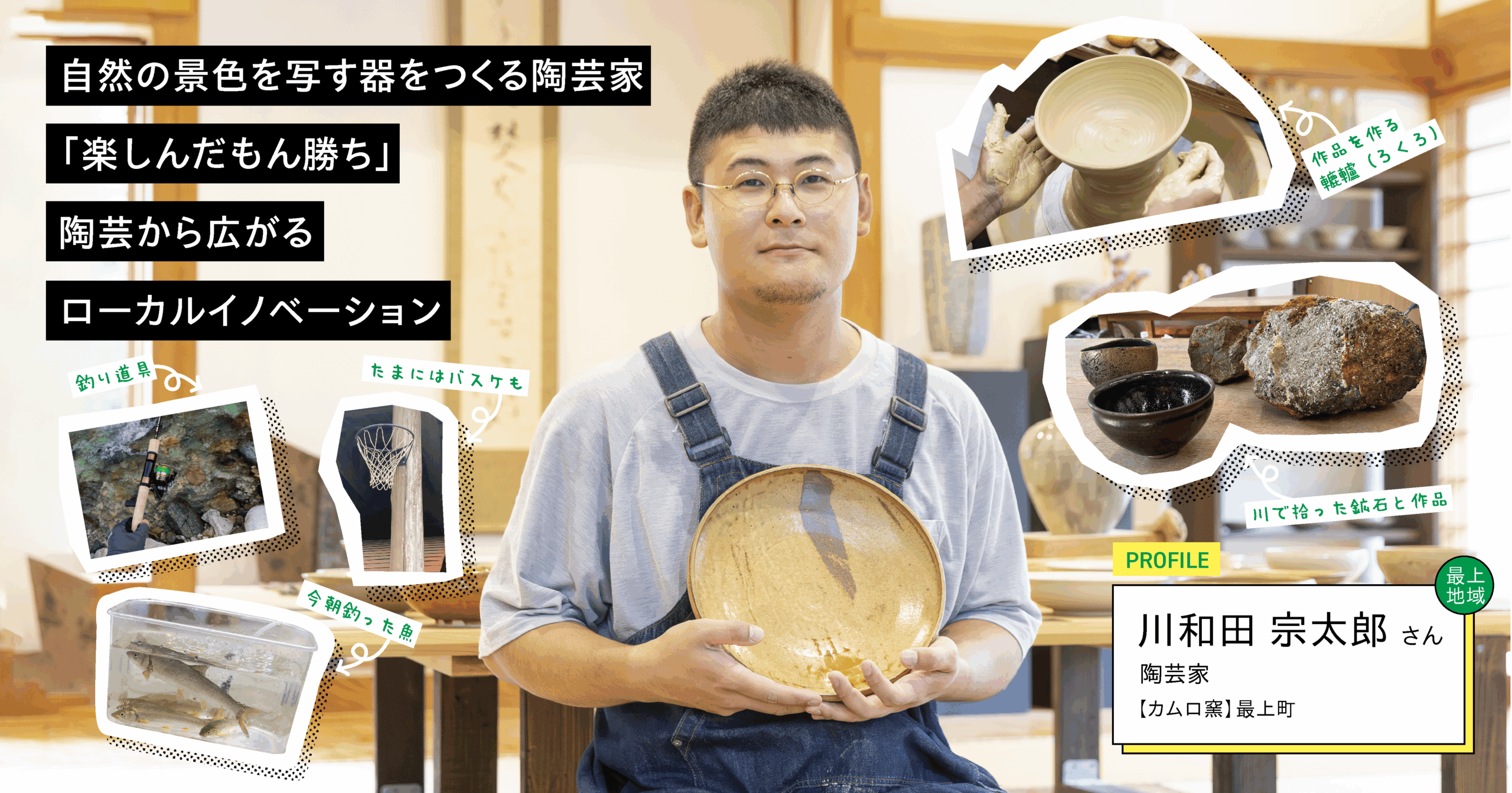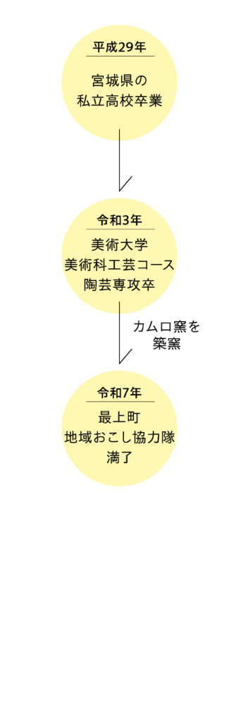 中高生時代、当初はバスケットボール部に所属し、東北大会にも出場するほど打ち込んでいた川和田さん。しかしプロへの道の厳しさを感じ、手先の器用さを生かして美術部へ転部。そこで出会った陶芸に夢中になり、美術大学へ進学を決意します。卒業後は陶芸を続けられる環境を求め、最上町の地域おこし協力隊としてカムロ窯を立ち上げました。「お客様から直接“ありがとう”と感謝の言葉をもらえる瞬間は、何度味わっても特別です。最上町の自然と人の温かさを映す風合いの作品をつくり、地域とともに歩む陶芸家として、今も挑戦を重ねています」と話します。